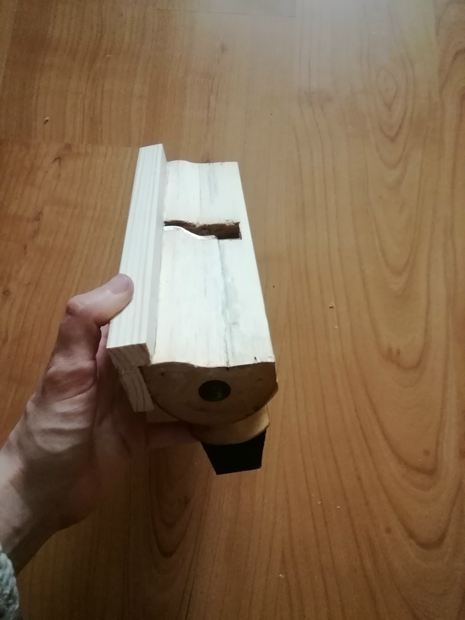 В ходе работ над наличником пришлось действовать так — выточить на станке лезвие, чтобы оно повторяло исторический профиль. Затем подогнать под этот узор подошву деревянного рубанка — то есть сделать новый калёвочник. Наконец, обработать им недостающий фрагмент наличника из нового материала.