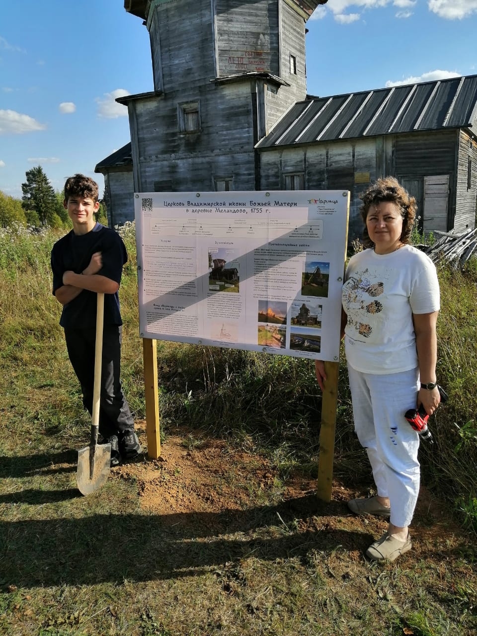 В Меландово Холмогорского района наши добровольцы Лена и Антон из Архангельска поставили информационный баннер о церкви Владимирской иконы Божией Матери и проведённых работах на ней. Под руководством их друга Алексея подготовили раму заранее, разобрали в Архангельске, привезли и собрали на месте. Также благодарим и Анну за подготовку информации, вёрстку и печать баннера.